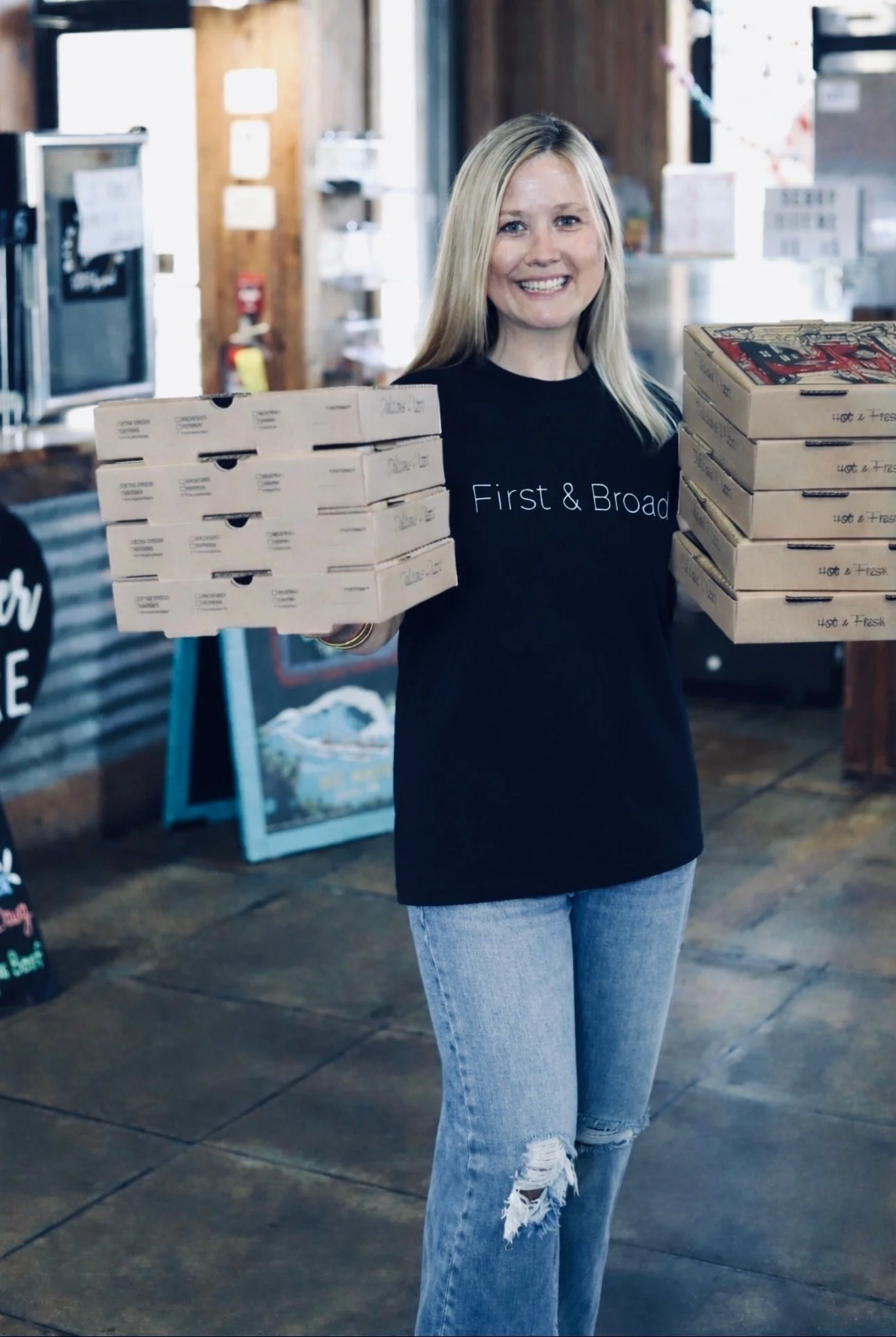 The exterior of First + Broad Pizza Company during sunset, featuring outdoor seating with picnic tables, potted plants, umbrellas, and illuminated windows and signs.